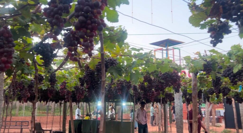 ഒരു വശത്തു പച്ച മുന്തിരി ആണെങ്കിൽ മറുഭാഗത്ത് പഴുത്തു തുടുത്ത മുന്തിരി കുലകൾ, ചില ഭാഗത്ത് കൃഷിയുടെ തുടക്കം.